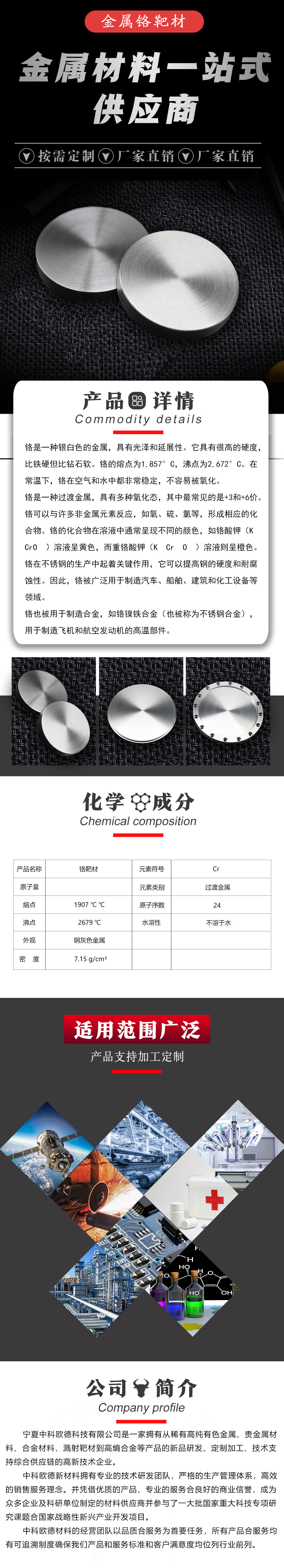 铬靶材是由高纯度铬金属制成的靶材,具有优异的物理和化学性质。它广泛用于半导体、显示器、太阳能电池等领域,作为溅射镀膜的主要材料,用于制备导电薄膜、防护层等。铬靶材以其高纯度、高溅射率和良好的附着性,在高科技制造中发挥着重要作用。